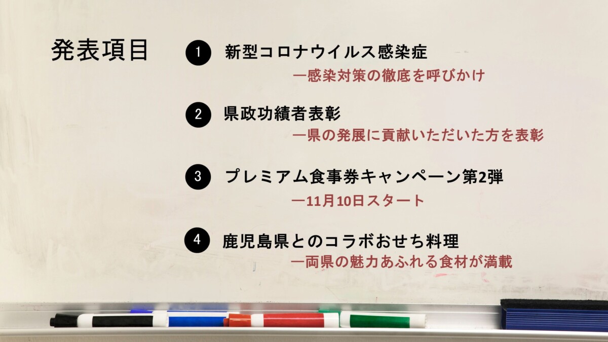 知事は会見で、今年度の県政功績者として51人を表彰することを公表した。内訳は特別感謝状1名、県政功績者50名となっている。特別感謝状を贈られるアラン・デュカス氏はフランス料理人で、県産日本酒や食材を使用して高付加価値化や国際的な認知度向上に貢献した。表彰式は11月20日に行われる。